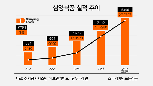 24일 금융정보업체 에프앤가이드에 따르면 삼양식품은 올해 매출 2조3737억 원, 영업이익 5346억 원의 실적을 기록할 전망이다.