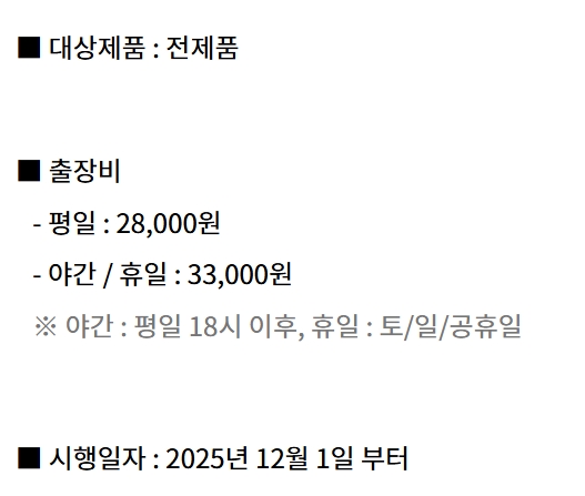 지난해 2월20일에는 야간 및 휴일 출장비를 2만6000원에서 3만 원으로 인상했다. 당시 기존 평일 출장비는 인상하지 않았다. 같은 해 9월14일에는 평일 출장비를 2만 원에서 2만5000원으로 올렸다.
