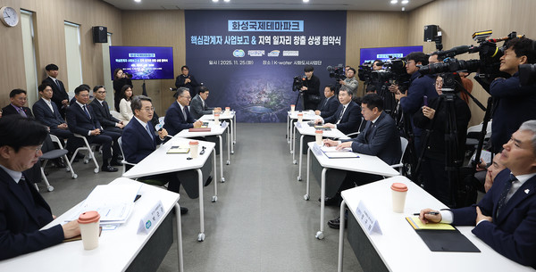 이날 김 지사는 화성시 소재 케이워터(K-water) 시화도시사업단에서 진행된 화성국제테마파크 사업보고 및 상생협약식에 참석했다.