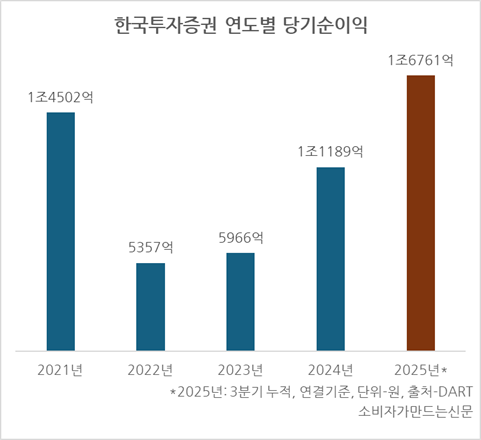 한국투자증권의 올해 3분기 누적 순이익은 연결기준 1조6761억 원으로 전년 동기 대비 60.9% 증가하며 국내 증권사 중 1위를 달성했다. 올해 상반기 증권사 중 최초로 반기 순이익 1조 원 돌파에 성공한 데 이어 3분기에도 순이익 6509억 원을 거둔 결과다.