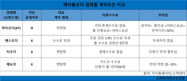 3일 소비자가만드는신문이 ▲하이오더(KT) ▲패스오더 ▲티오더 ▲메뉴잇 등 주요 테이블오더 4개 업체를 조사한 결과 수수료 체계와 해지 위약금·계약 구조가 불투명해 소비자가 비교 선택하기 어려웠다. KT 하이오더를 제외하면 모두 홈페이지에 약관을 공개하지 않고 있다. 공식적인 입장도 밝히지 않아 홈페이지에 게시된 안내와 고객센터에 문의한 내용을 기반으로 조사했다.