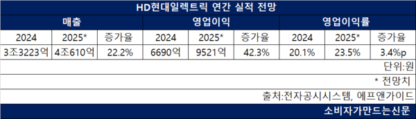 3일 금융정보업체 에프앤가이드에 따르면 HD현대일렉트릭의 올해 매출은 4조610억 원으로 전년 대비 22.2% 증가할 것으로 전망된다. 영업이익은 9521억 원으로 42.3% 증가할 것으로 보인다.