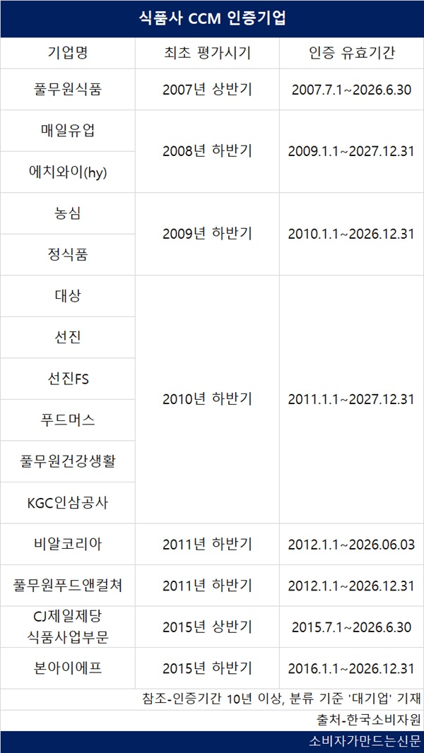 △대상 △KGC인삼공사는 2010년 하반기 첫 인증 이후 2027년까지 17년간 △비알코리아 △풀무원푸드앤컬처는 2026년 말까지 15년째 CCM인증을 이어오고 있다. △본아이에프 △CJ제일제당 식품사업부문은 2015년 평가 받은 이후 11년째 인증을 보유하고 있다.