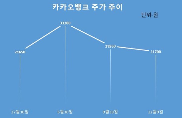 올해 카카오뱅크 주가는 급등락을 반복했다. 작년 말 2만1650원에서 마감했던 주가는 상반기 3만3280원을 기록하며 고점을 달성했지만 하반기 들어 하락세로 전환되며 지난 9일 기준 종가는 2만1700원에 머물렀다. 연초 주가와 큰 변화가 없는 셈이다.