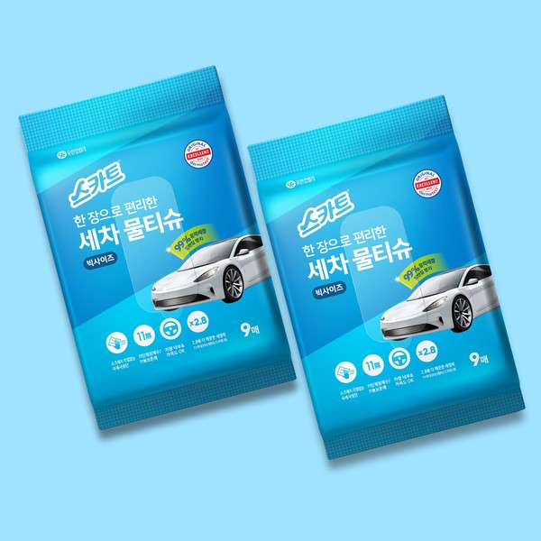 스카트 세차물티슈는 가정용으로 널리 사용되고 있는 ‘스카트 잘 닦이는 세정티슈’ 대비 2.8배 강력한 세정력을 갖췄다. 전문 시험기관을 통해 확인된 99% 유막 세정으로 난반사로 인한 빛 번짐을 방지할 수 있다. 차량 내부 가죽의 재오염도 방지하도록 설계돼 차량 내외부에 모두 사용 가능하다.