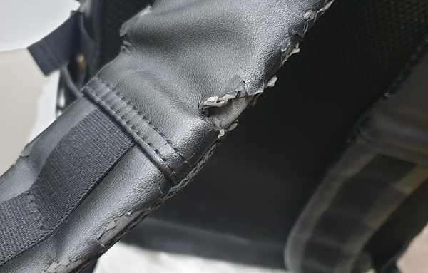 이 씨에 따르면 사용한 지 얼마 되지 않은 백팩의 몸통 부분 코팅이 벗겨지면서 검은 가루가 계속 떨어졌다. 정상적인 사용이 어려운 상태지만 구매처는 보증서가 없다는 이유로 AS는 물론 환불이나 보상도 전혀 불가능하다는 입장만 되풀이하고 있다.