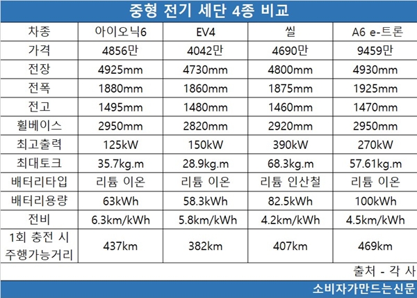 중형 전기 세단 선택지가 크게 늘어난 가운데 △현대차 ‘아이오닉6’ △기아 ‘EV4’ △BYD ‘씰’ △아우디 ‘A6 e-트론’이 대표 주자로 꼽힌다. 내연기관 차량은 크기와 배기량으로 차급을 구분하지만 전기차는 크기로만 차급을 구분해 같은 중형 세단이라도 출력 등 스펙 편차가 크다. 비교는 기본 트림을 기준으로 했다.