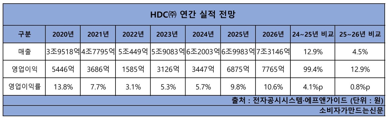 31일 금융정보업체 에프앤가이드에 따르면 HDC(주)는 올해 매출 6조9983억 원, 영업이익 6875억 원을 기록할 전망이다. 전년 대비 매출은 12.9%, 영업이익은 99.4% 증가한 수치다.