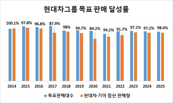 지난해 목표치를 넘기지 못하면서 2014년 이후 11년 연속 목표 미달이 이어졌다. 2014년 현대차그룹은 현대차는 496만3456대, 기아는 290만7757대를 판매해 합산 787만1213대를 기록했다. 목표 판매 대수 786만대를 웃돌며 달성률 100.1%를 기록했다. 이후 판매 목표 달성률은 2020년 84.3%까지 하락했다가 2021년부터 90%대로 복귀했다.