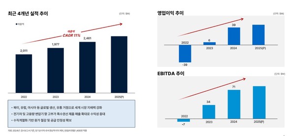 점유율 확대를 위해 지난해 3월 북미 공장에 생산라인 2기를 추가 설치했다. 또 3500톤 수준인 생산능력을 2030년까지 8500톤으로 늘릴 예정이다. 전기차·에너지향 고부가 제품 비중도 확대해 나갈 계획이다.