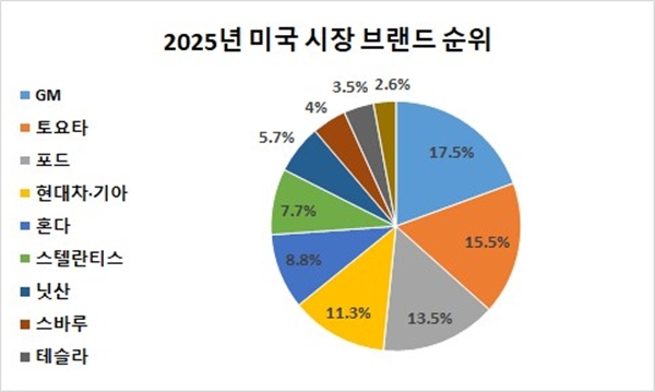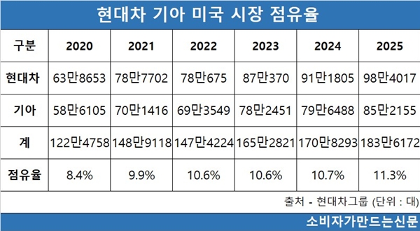 이같은 판매량에 힘입어 현대차와 기아의 지난해 미국 시장 점유율은 2024년 대비 0.6%포인트 상승한 11.3%를 기록했다.