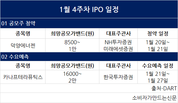 [주간IPO] 1월 넷째 주, 덕양에너젠 공모청약…카나프테라퓨틱스는 수요예측 연기할듯
