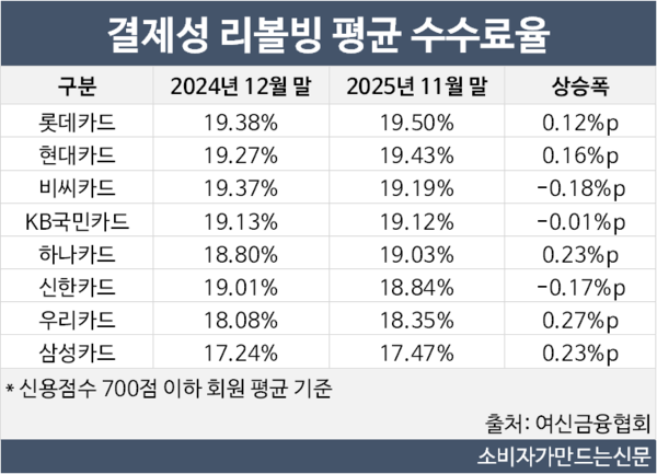 19일 여신협회에 따르면 지난해 11월 말 기준 8개 전업카드사의 700점 이하 평균 회원에게 적용되는 리볼빙 금리는 17.47%~19.5%로 집계됐다.