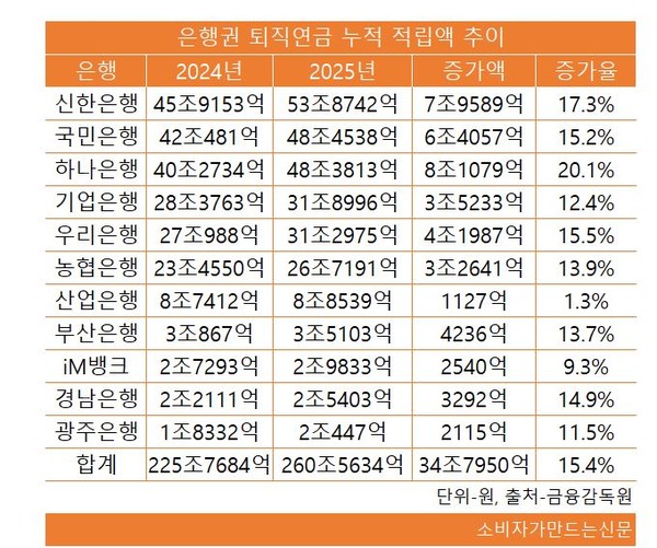 지난해 12월 말 기준 은행권 퇴직연금 누적 적립액은 260조5634억 원으로 전년 225조7684억 원 대비 34조7950억 원 증가했다. 증가율은 15.4%다.