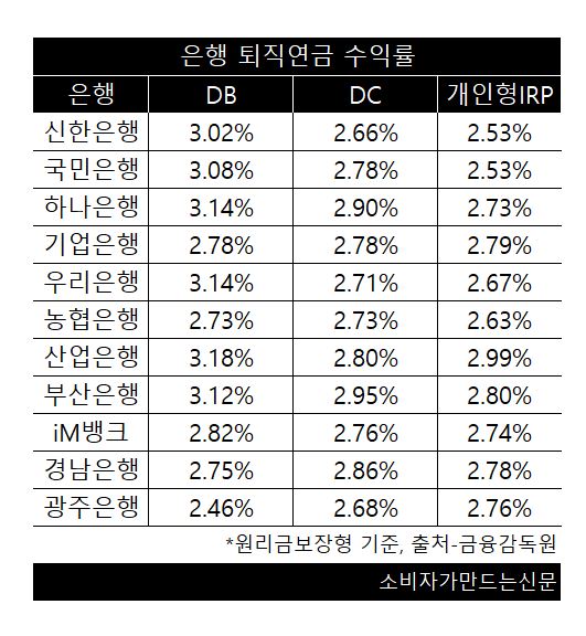 한편 연간 수익률은 산업은행(회장 박상진)이 부문별로 고루 높았다. 적립액의 약 90% 가량 몰린 원금보장형 기준으로 산업은행은 DB 3.18%, 개인형 IRP 2.99%로 1위를 차지했다. DC 1위는 부산은행으로 2.95%다.