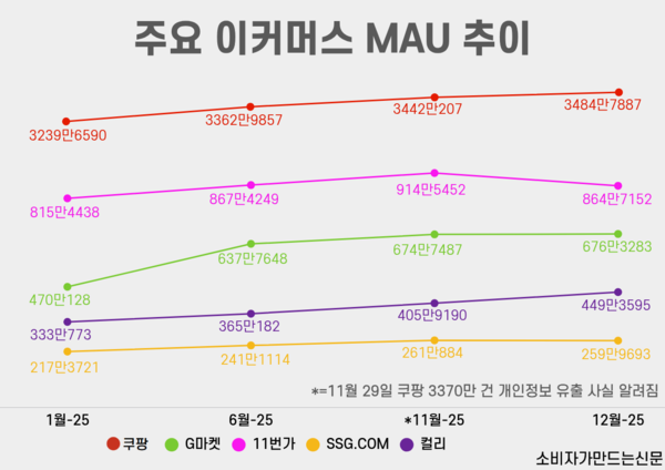11월 말 쿠팡 개인정보 유출 피해 규모가 대폭 확대됐다는 사실이 알려진 이후 타 이커머스 대비 쿠팡의 이용자 성장세에 제동이 걸린 것으로 보고 있다. 올해 1월 들어서도 쿠팡의 이용자 지표는 뚜렷한 반등을 보여주지 못했다.