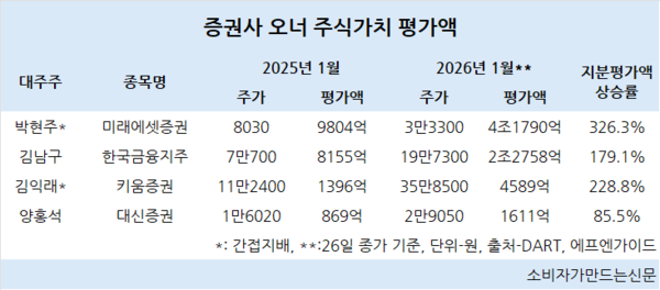 27일 소비자가만드는신문이 주요 증권사 오너의 주식자산을 분석한 결과 박 회장이 간접지배하는 미래에셋증권 지분가치는 지난해 1월 초 9804억 원에서 올해 1월(26일 기준) 4조1790억 원으로 1년 사이 3조1986억 원(326.3%) 상승했다.