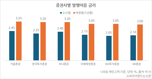 지난해 12월 발행어음 상품 판매를 시작한 키움증권은 26일(원화, 개인 대상) 기준 수시형 금리 연 2.45%, 약정형(1년물) 금리 연 3.25%로 6개 발행어음 사업자 중 가장 높은 금리를 제공하고 있다.