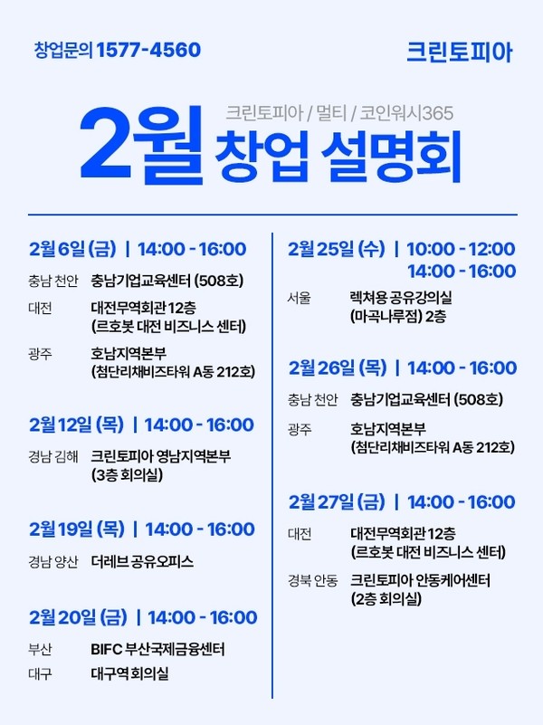 설명회에서는 세탁 편의점 형태의 ‘크린토피아’, 무인 운영이 가능한 ‘코인워시365’, 두 모델을 결합한 ‘크린토피아 Multi’ 등 다양한 창업 모델을 비교해 소개한다. 각 모델의 운영 방식과 특징을 중심으로 예비 창업자가 자신의 자금 규모와 운영 여건에 맞는 창업 형태를 검토할 수 있도록 구성했다. 설명회 참석이 어려운 예비 창업자를 위해 담당자가 직접 찾아가는 개별 상담 서비스도 함께 제공된다.