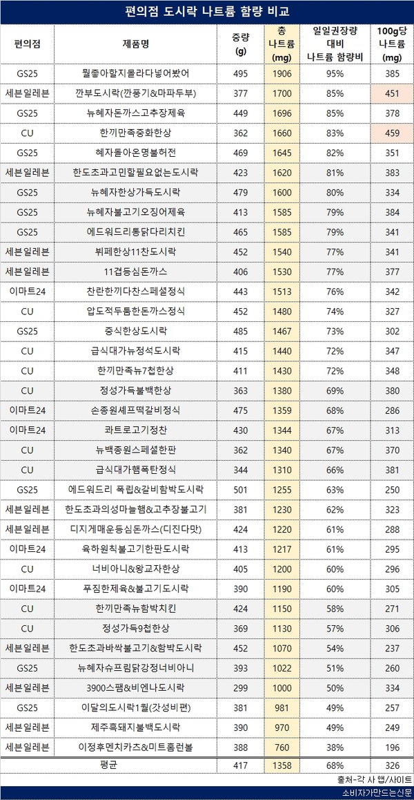 29일 소비자가만드는신문이 △GS25 △CU △세븐일레븐 △이마트24 등 4개 편의점에서 판매하는 도시락 35종을 비교 분석한 결과 평균 나트륨 함량이 하루 권장섭취량의 68%인 1358mg으로 조사됐다. 양념한 고기, 간이 센 중화식 메뉴가 들어간 도시락일수록 나트륨 함량이 높았다.