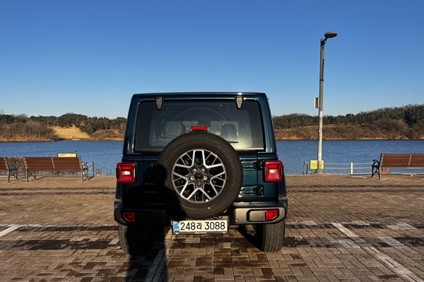 랭글러 특유의 원형 헤드램프에는 서라운딩 링 타입의 LED 헤드램프가 적용됐다. 총 6개의 주간주행등(DRL)을 배치해 시인성을 높였다. 측면과 후면은 각진 형태의 랭글러 디자인을 유지했다. 짙은 블루 톤의 패덤 블루 컬러와 어우러져 차체의 형태가 더욱 강조됐다.