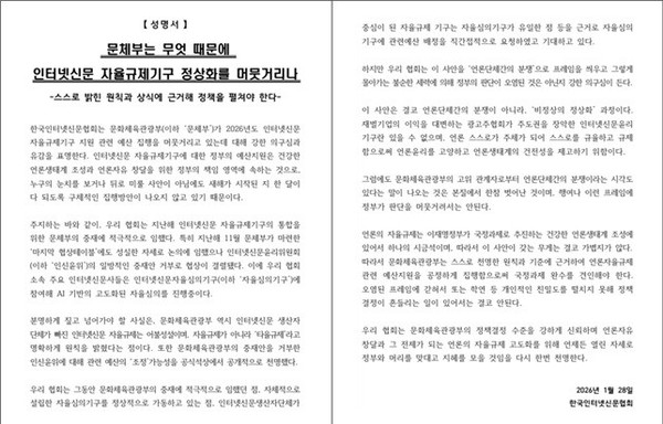 한국인터넷신문협회가 28일 성명서를 내고 2026년도 인터넷신문 자율규제기구 지원 예산 집행을 머뭇거리는 문화체육관광부의 태도에 대해 의구심과 유감을 표명했다.