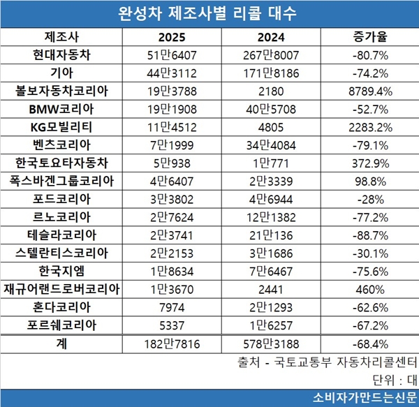 4일 국토교통부 자동차리콜센터에서 집계한 2025년 자동차 제조사별 리콜 차량 대수는 총 182만7816대로 전년(578만3188대) 대비 68.4% 감소했다. 2025년 1월1일부터 12월31일까지 안전결함 관련 국토교통부 리콜과 배출가스 관련 환경부 리콜을 합산했다.