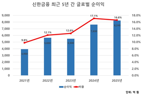 지난해 신한금융의 글로벌 순이익은 전년 대비 8% 증가한 8240억 원을 기록했다. 특히 진옥동 회장 취임 첫 해였던 2023년과 비교해보면 5500억 원에서 8240억 원으로 임기 중 49.8%나 급증했다.