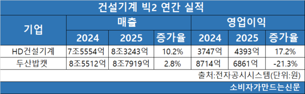 연결 조정 전 단순 합산 기준으로 HD현대건설기계와 HD현대인프라코어의 2025년 합산 매출은 약 8조3243억 원으로 전년 대비 10.2% 증가했다. 영업이익은 4393억 원으로 17.2% 늘었다.