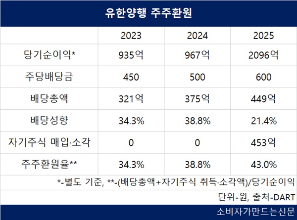 12일 전자공시시스템에 따르면 유한양행의 2025년도 결산배당에서 주당배당금은 600원으로 전년 대비 100원 늘었다. 2023년도와 비교하면 450원에서 33.3% 늘었다.