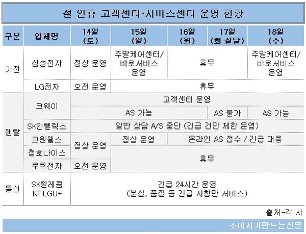 코웨이는 14일(토)부터 18일(수)까지 설 연휴 기간 고객센터를 상시 운영한다는 계획이다. AS는 설 당일인 17일(화)을 제외하고 이용 가능하다. SK인텔릭스는 14일(토)부터 18일(수)까지 일반 고객상담 및 AS 운영을 중단하지만누수·화재 등 긴급 사항에 대해 제한적으로 상담 및 AS를 제공한다.