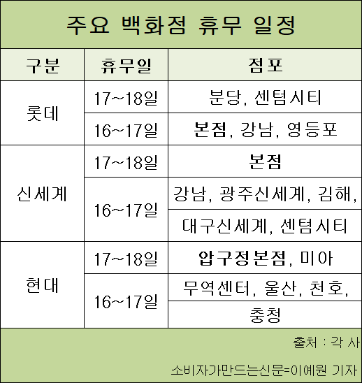 롯데백화점 ▲분당점 ▲센텀시티점은 17~18일 쉰다. ▲본점 ▲강남점 ▲영등포점 등은 16~17일 문을 닫는다.