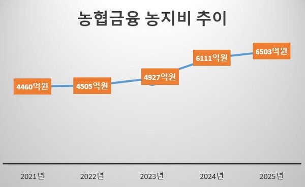 실제로 지난 2021년 기준 농협금융의 농지비 반영전 순이익은 2조6034억 원, 농지비는 4460억 원이었는데 5년이 지난 2025년 기준 순이익은 2조9718억 원, 농지비는 6503억 원이었다. 같은 기간 순이익은 14.2% 증가했지만 농지비는 무려 45.8%나 급증했다. 증가폭으로도 같은 기간 순이익이 3684억 원 늘어날 동안 농지비도 2043억 원이나 증가했다.