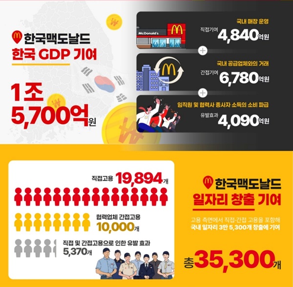 발표에 따르면 먼저 맥도날드의 연간 국내 GDP 기여 금액은 1조5700억 원, 직접 기여분 4840억 원으로 조사됐다. 간접기여는 6780억 원, 유발 효과는 4090억 원이다. 맥도날드의 사업 활동이 식자재, 물류, 유통, 서비스 등 다양한 산업으로 연결되며 한국 경제 전반에 연쇄적인 부가가치를 창출하고 있음을 보여주는 대목이다.