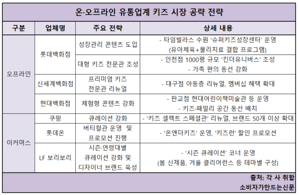 유통업계가 키즈시장 공략에 집중하고 있다. 오프라인 유통 업계는 대형 전문관 구축 등 키즈 관련 콘텐츠를 강화하고 있고 이커머스는  키즈 맞춤형 상품을 제안하는 큐레이션 서비스를 확대하고 있다.