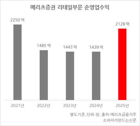 지난해 메리츠증권의 리테일부문 순영업수익은 전년보다 47.9% 증가한 2128억 원을 기록해 2021년 이후 4년 만에 리테일 순영업수익 2000억 원 돌파에 성공했다.