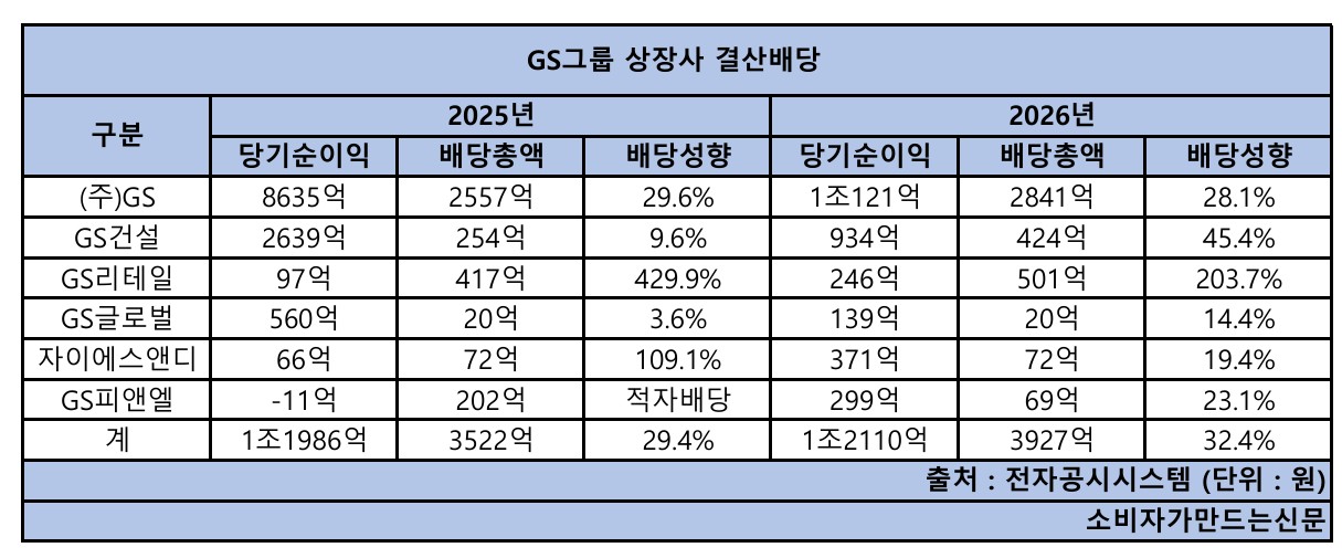 (주)GS(대표 허태수·홍순기), GS건설(대표 허윤홍), GS리테일(대표 허서홍) 등 GS그룹 주력 계열사 3곳이 일제히 2025년 회계연도 배당금을 늘렸다.