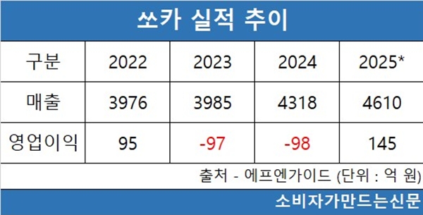 쏘카의 매출은 2022년 3976억, 2023년 3985억, 2024년 4318억 원을 기록하며 매년 늘었다 . 지난해 매출은 4610억 원으로 전년 대비 6.8% 증가할 것으로 전망된다.