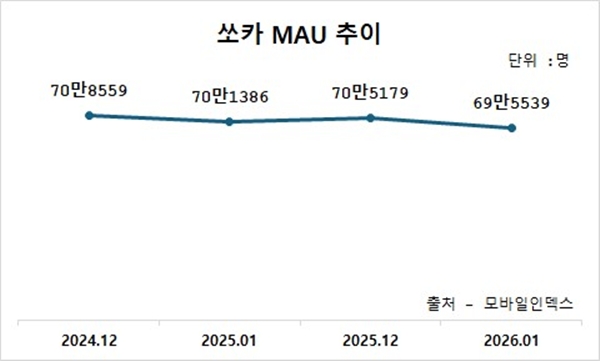 모바일인덱스에 따르면 쏘카의 2025년 12월 MAU는 70만5179명으로 전년 동월 대비 0.5% 감소했다.