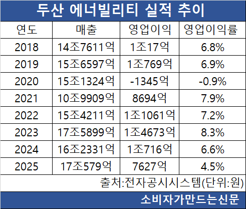 이는 연결 기준 실적에 반영되는 자회사 두산밥캣의 실적 둔화와 과거 저수익 플랜트 프로젝트 비용 반영 등이 영향을 미친 것으로 분석된다. 여기에 원전과 가스터빈 등 성장 사업의 매출 인식이 본격화되지 않은 점도 단기 수익성에 부담으로 작용한 것으로 보인다.