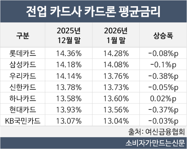 하락폭이 가장 큰 곳은 우리카드다. 우리카드의 카드론 평균금리는 지난해 말 14.14%에 달했으나 지난달 13.76%로 집계되며 0.38%포인트 떨어졌다.