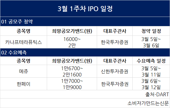 신약 개발 업체 카나프테라퓨틱스는 3월 5일과 6일 양일간 코스닥 상장을 위한 공모청약을 실시한다. 희망공모가는 1만6000원~2만 원으로 4일 공모가가 확정된다. 대표주관사는 한국투자증권이다.