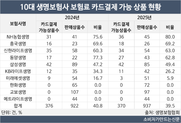 그러나 한화생명, 교보생명, 메트라이프생명 3곳은 카드납 가능 보험상품이 하나도 없었다.