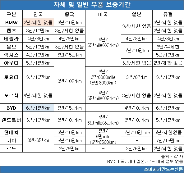 현대차, 기아, 르노 등 국산차는 물론 벤츠, 테슬라, 볼보 등 한국에서 전기차를 판매하는 브랜드 가운데 BMW보다 차체 및 일반부품의 보증기간이 짧은 곳은 없다. ▶벤츠 ▶토요타 ▶랜드로버 등은 3년 또는 10만km의 보증기간을 제공한다. ▶현대차 ▶기아 ▶르노 등 국산차는 3년 또는 6만km 기준으로 BMW보다 1년 더 길다.