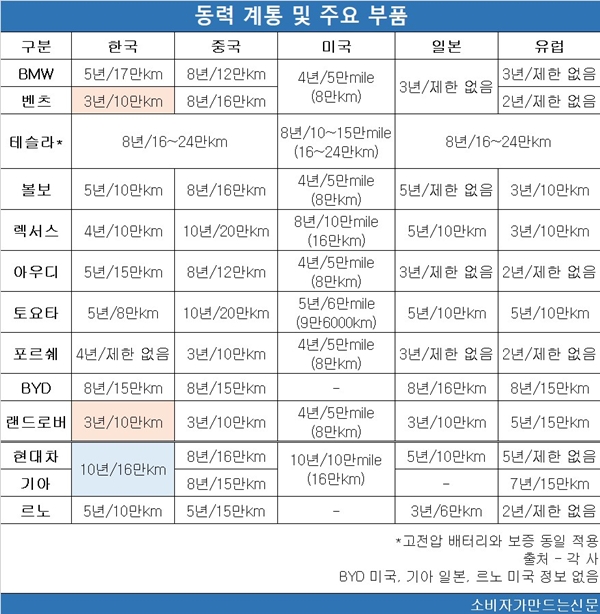 현대차와 기아의 한국 시장 보증기간은 10년 또는 16만km로 주요 시장 대비 우호적이다. 중국·일본·유럽에서 제공하는 보증기간 대비 길고 미국과 비슷한 수준이다.