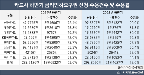 2024년 하반기 수용률 1위를 차지했던 우리카드는 지난해 80%를 기록하며 3위에 자리했다. 그러나 여전히 평균을 훌쩍 넘는 수치다.