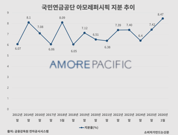 국민연금이 아모레퍼시픽 지분을 8%대로 확대한 것은 2018년 5월 8.09% 이후 8년 만이다. 국민연금은 2014년 11월 8.1%, 2018년 5월 8.09%로 지분을 늘린 뒤 6~7%대에서 비중을 조정해 왔다.