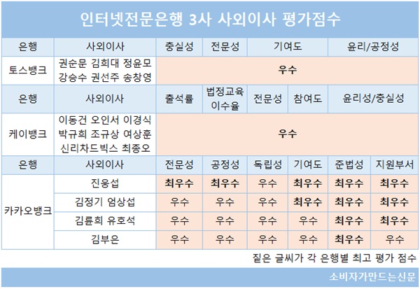 토스뱅크는 2025년 평가 기준 현직 사외이사 6명에게 충실성, 전문성, 기여도, 윤리/공정성 등 4개 부문에 모두 최고점인 '우수' 등급을 내렸고 케이뱅크도 사외이사 8명 전원에게 출석률, 법정교육이수율, 전문성, 참여도, 윤리성/충실성 부문 모두 '우수' 등급을 책정했다.