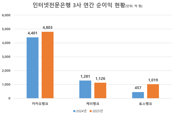 성장성에 대한 물음표도 커졌다. 케이뱅크 지난해 당기순이익은 1126억 원으로 전년 대비 12.1% 줄었다. 카카오뱅크·토스뱅크 등 인터넷전문은행 3사 가운데 유일하게 순이익이 감소했다.