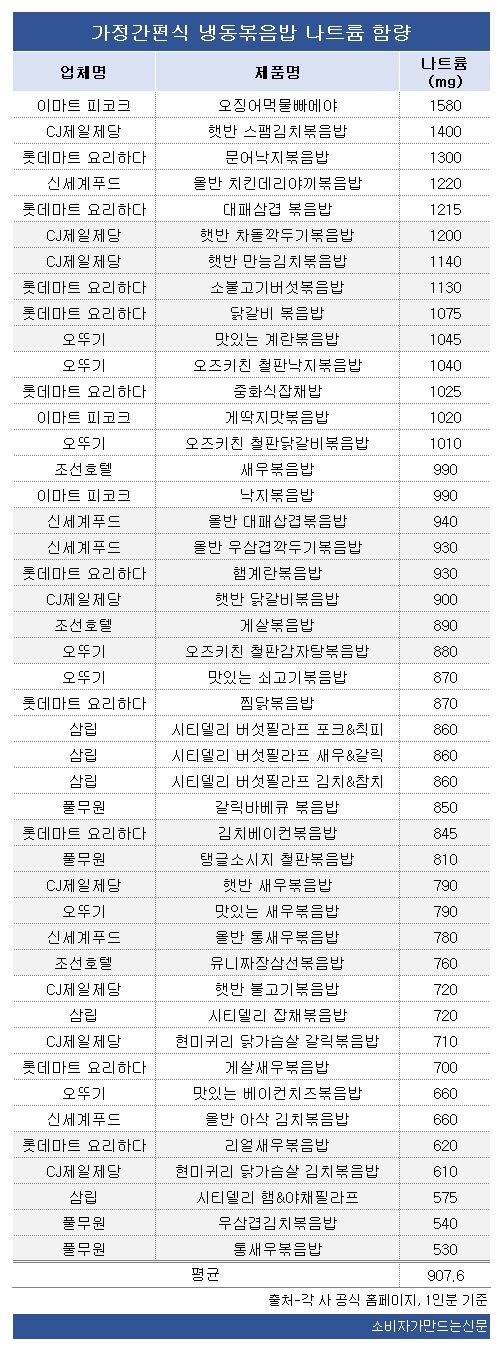 ▶롯데마트 PB인 요리하다의 '문어낙지볶음밥(1300mg)'·'대패삼겹볶음밥(1215mg)'·'소불고기버섯볶음밥(1130mg)'·'닭갈비볶음밥(1075mg)'·'중화식잡채밥(1025mg)' ▶신세계푸드 '올반 치킨데리야끼볶음밥(1220mg)' ▶CJ제일제당 '햇반차돌깍두기볶음밥(1200mg)'·'햇반 만능김치볶음밥(1140mg)' ▶오뚜기 '맛있는 계란볶음밥(1045mg)'·'오즈키친 철판닭갈비볶음밥(1010mg)' ▶이마트 '피코크 게딱지맛볶음밥(1020mg)' 등 12개 제품도 나트륨 함량이 1000mg을 상회한다. 한 끼 식사만으로 하루 기준량(2000mg)의 절반을 섭취하게 되는 셈이다.
